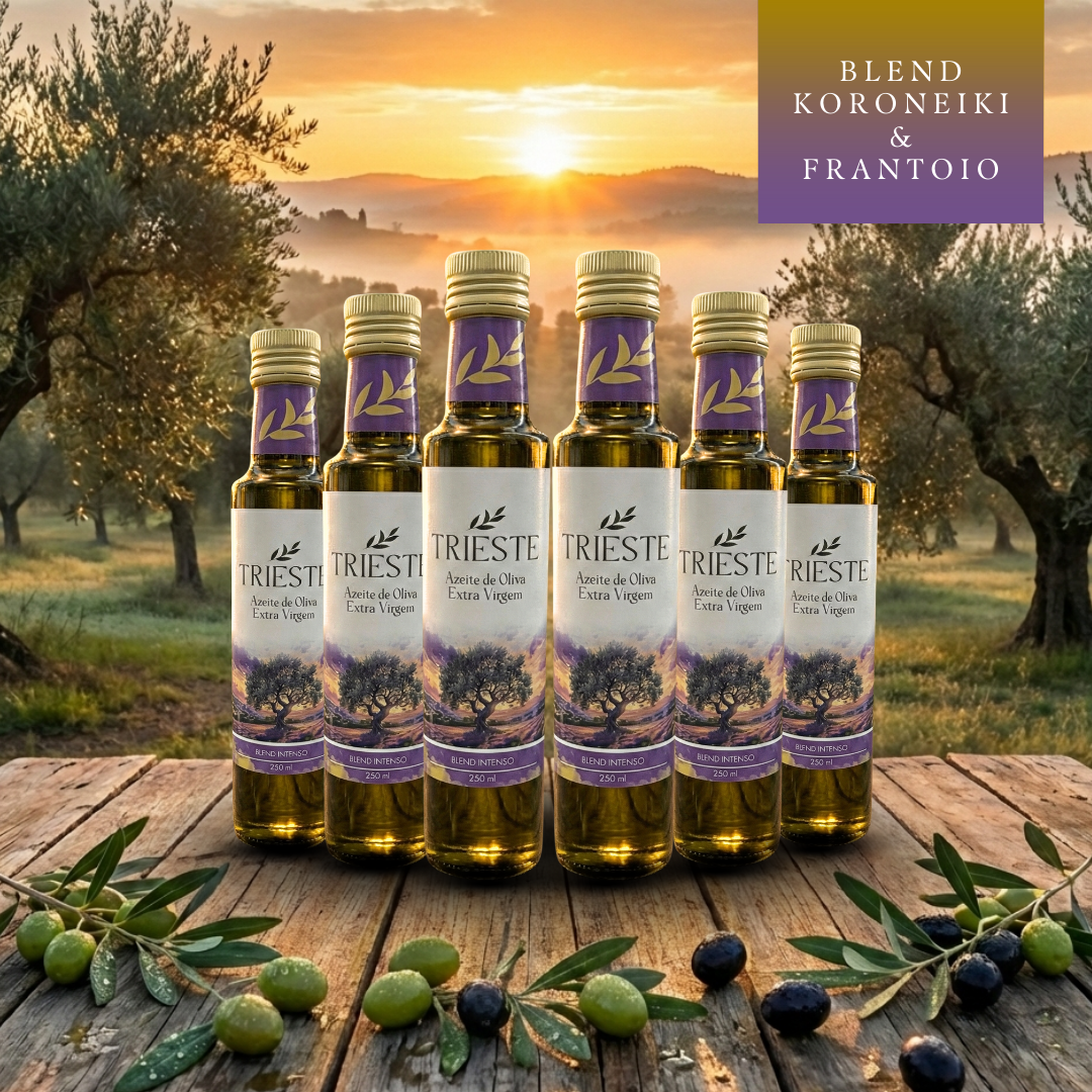 Conteúdo: caixa com 6 Unidades de Azeite Extra Virgem (250ml) Blend Intenso – Koroneiki e Frantoio.