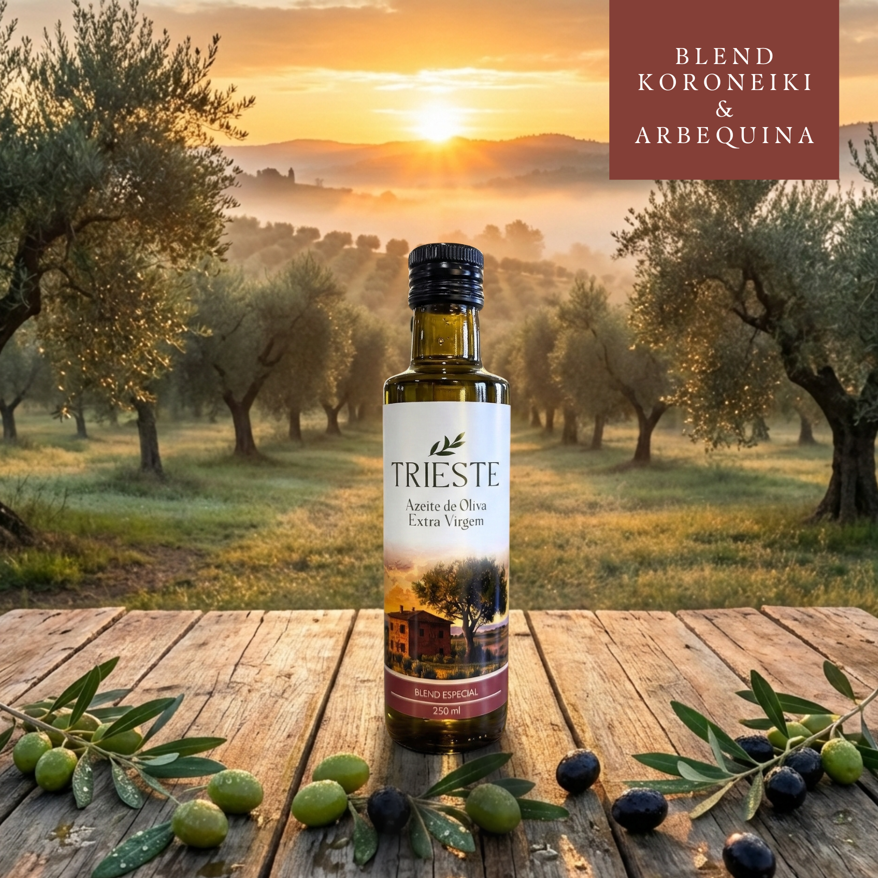 Um blend muito especial. Koroneiki de origem grega e arbequina de origem espanhola, produz um azeite equilibrado, aromático de frutado médio e amargor equilibrado. Boa harmonização com peixes brancos, sushis, saladas de frutas, sorvetes e sobremesas à base de chocolates.